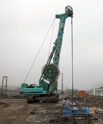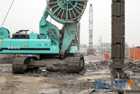 该工地基坑设计深度25米,连续墙宽度1米、深度40~50米。由于地层复杂,50米以上粘土层、细沙层、卵石层交错,承压水深,临近地铁要求施工震动小等因素,给施工带来不小困难。施工单位华东建设基础工程有限公司,引进我公司SG35、SG40A、SG50等5台液压连续墙抓斗和其他厂家两台设备,凭着优越的性能、良好的可靠性和出色的效率,金泰抓斗以每台每天开挖200~250方的速度,昼夜奋战工地前线,按时完成施工任务,得到施工单位的充分肯定,形成鲜明对比的是工地上其他厂家的抓斗施工效率仅为金泰抓斗的三分之二。