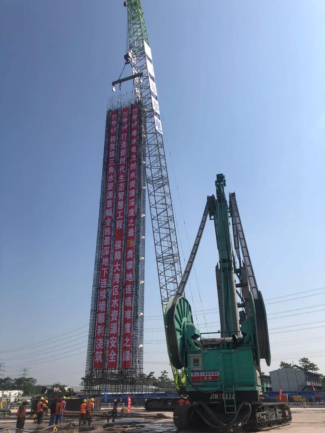 特别在2019年11月8日,这是国产双轮铣在发展史上值得记上一笔的一天,现场经过项目管理人员、设备机手连续多天的钢筋笼加工和成槽施工,现场成功下入首幅长度为77.98m的钢筋笼,并在晚11点完成浇筑。此次地连墙钢筋笼成功的吊装、浇筑对金泰来说意义深远,在全力保障大湾区水资源安全建设的同时,更成就了金泰双轮铣在国产双轮成槽深度的里程碑时刻。